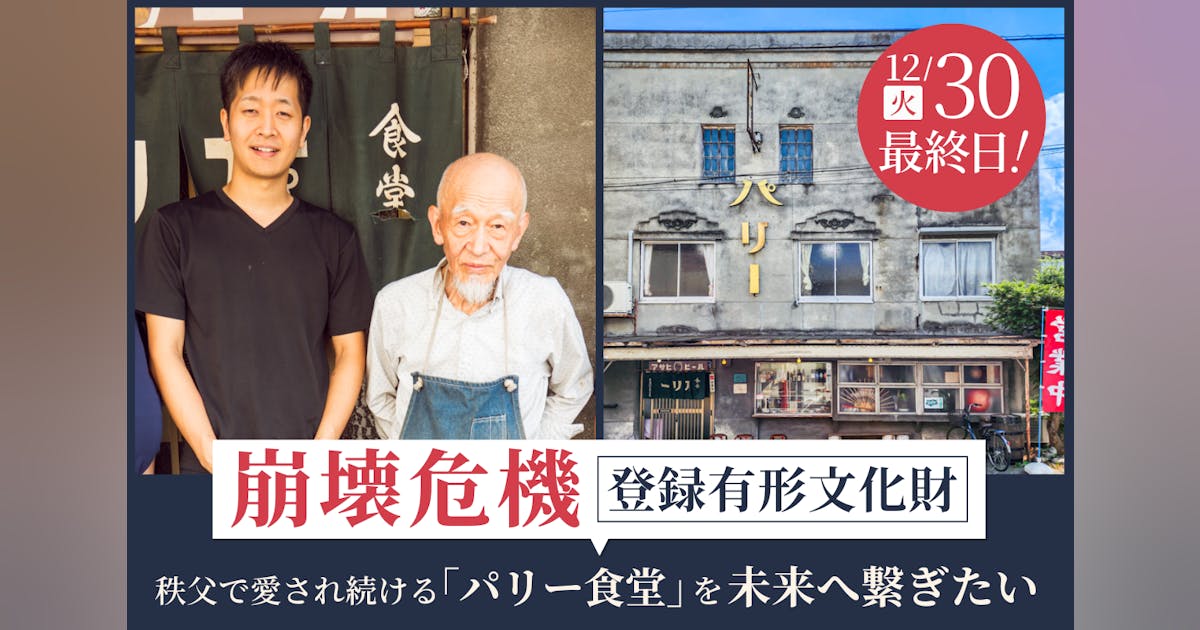 創業100年、国の登録有形文化財に指定された老舗洋食店「パリー食堂」が危機に瀕しています。耐震診断で明らかになった崩壊の危険性。修繕費用は4,000万円。昭和の記憶が息づく「地域の記憶装置」を未来に残すため、クラウドファンディングに挑戦しま...