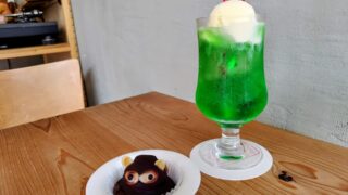 グリーン際立つメロンソーダにアイスクリーム、そしてちょこんと乗った真っ赤なチェリーは、昭和の風を感じつつも、こんなにお洒落なカフェでいただくとネオ感も感じちゃう。